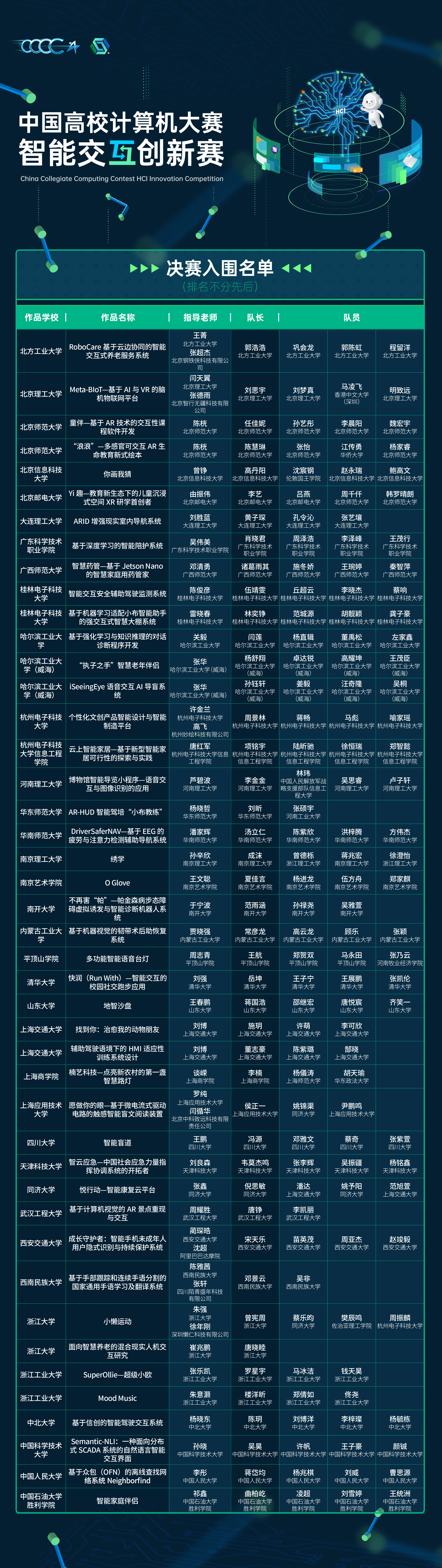 2022年“中国高校计算机大赛—智能交互创新赛”秉持公平、公正、公开的原则,评审专家组根据评审规则,对参赛作品进行综合评估,最终评选推举出44支参赛队伍晋级决赛。现将决赛入围名单进行公示。