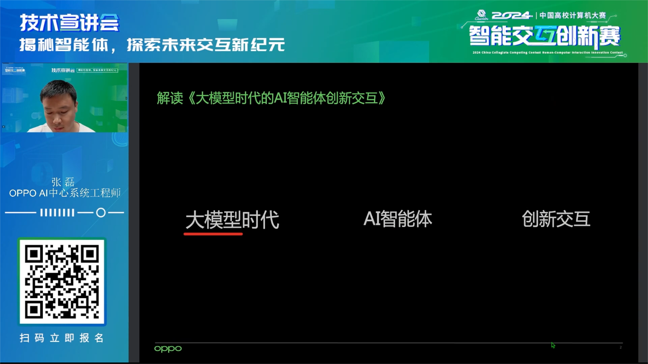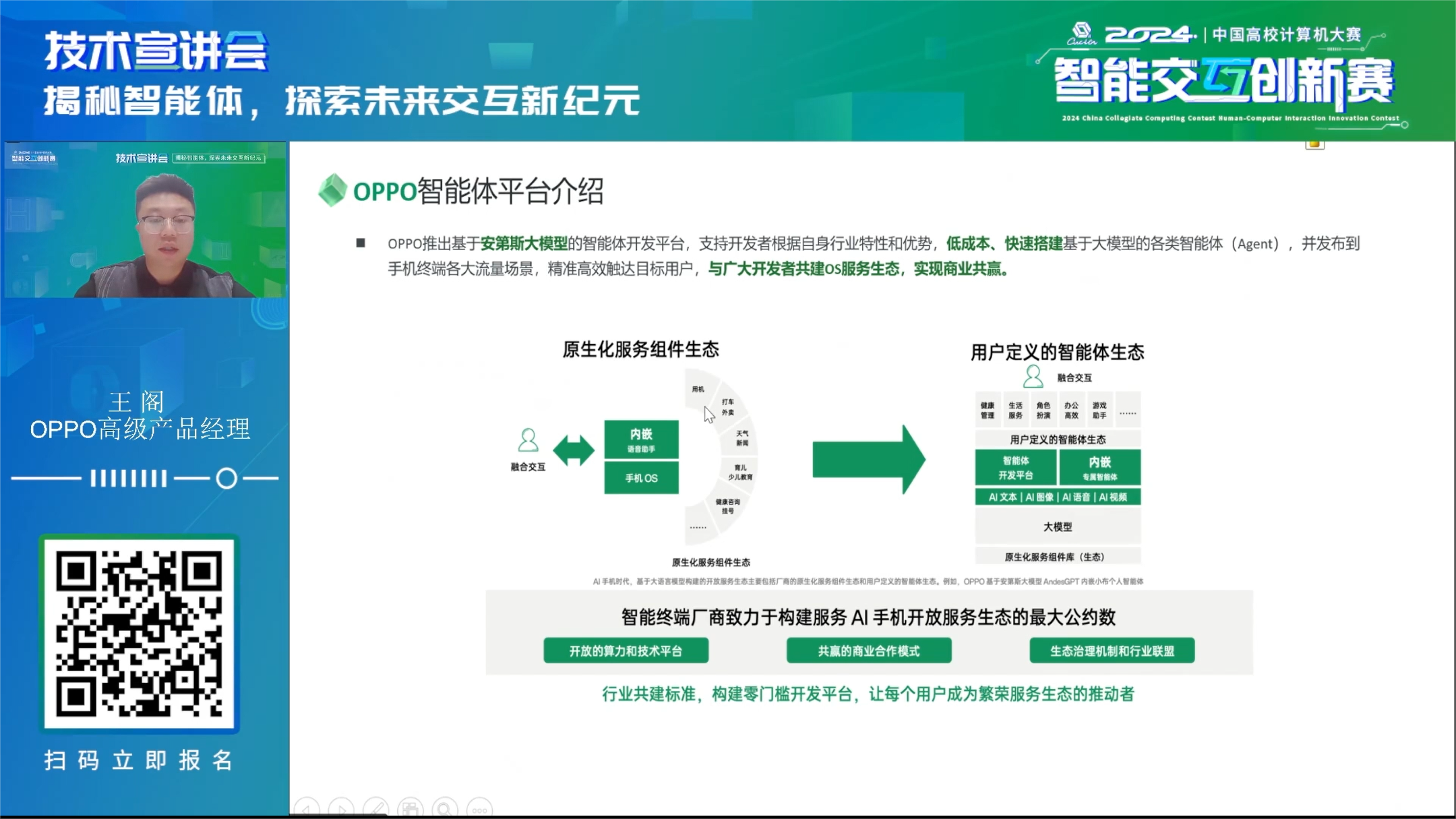 张磊工程师重点介绍了OPPO AI技术平台,这是本次大赛的技术支持平台。他详细解释了大语言模型在智能交互中的应用,以及如何利用这一技术消除人机交互的门槛,实现更加流畅的交互体验。